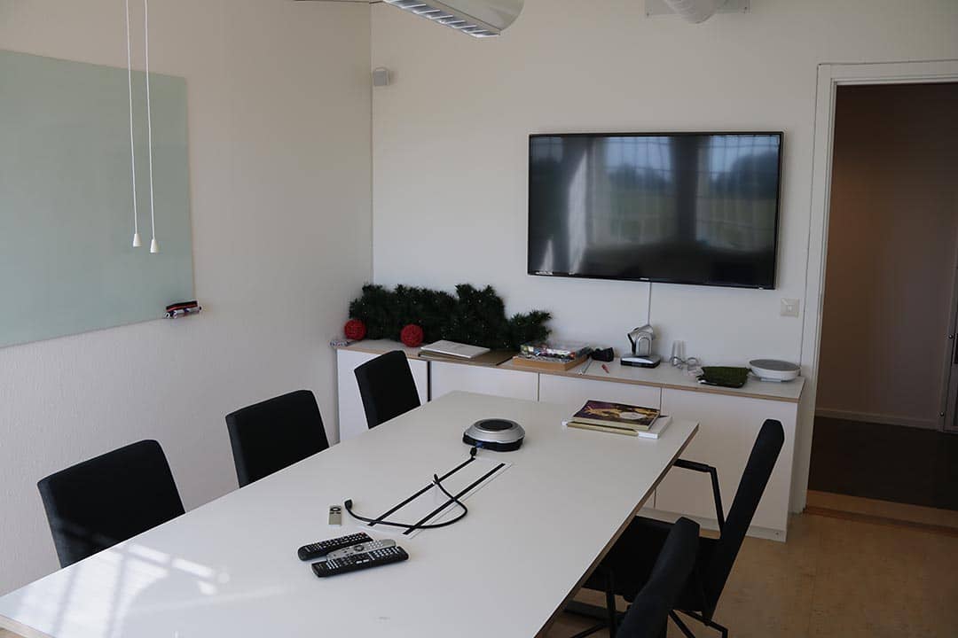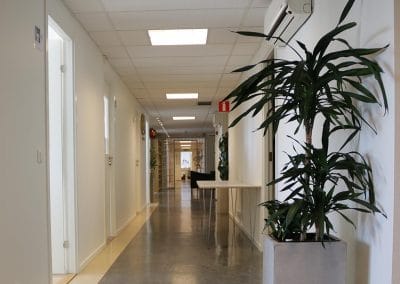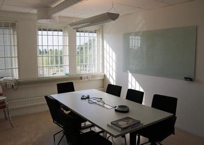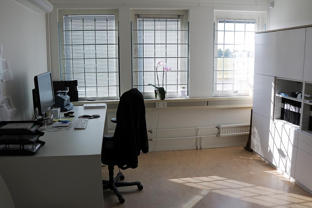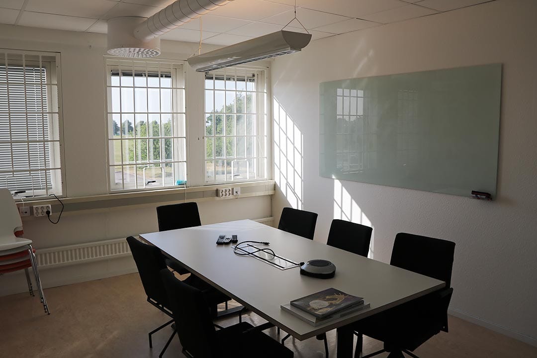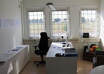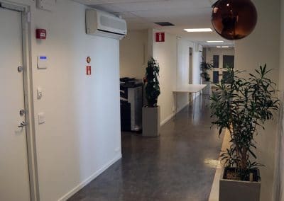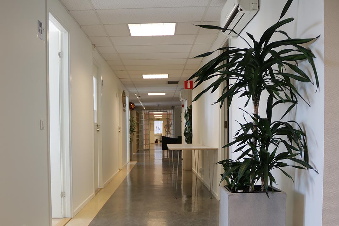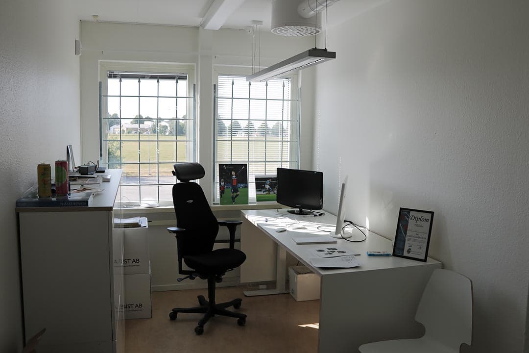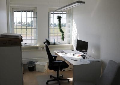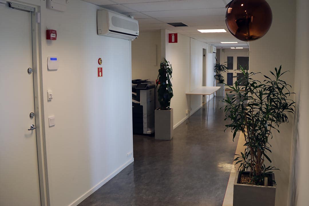Hela lokalen är på ungefär 400 kvadratmeter och vi sitter själva i den inre delen av lokalen. Konferensrum, kök, fika- och lunchrum, utrymmen för skrivare samt toaletter delar vi och våra hyresgäster på. Ytan vi hyr ut är på cirka 210 kvadratmeter och det finns totalt sju kontorsrum på den ytan samt ett större rum utan fönster att använda för förvaring/arkiv. Några av kontorsrummen är så stora att man kan sitta två eller flera i dem.